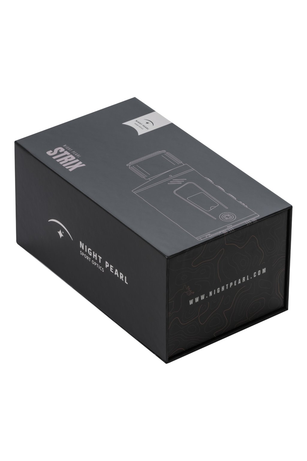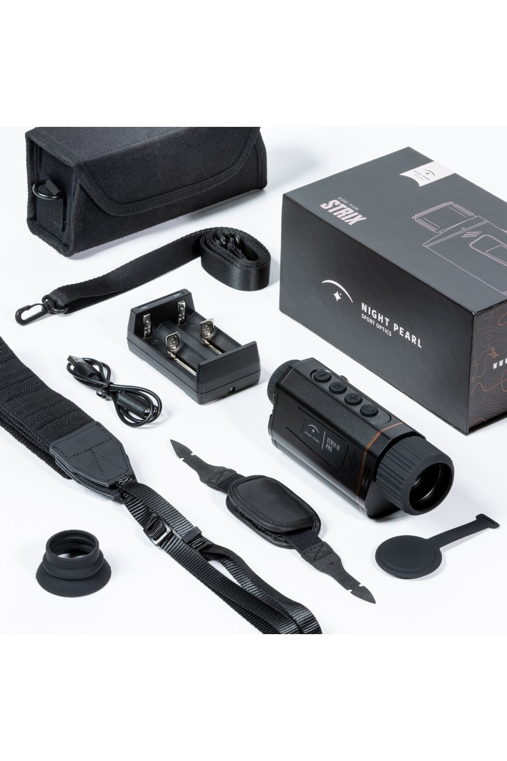 Obsah balení: Night Pearl Strix, 2x akumulátor 18650, SD karta 32 GB, gumová očnice, nabíjecí kabel, nabíječka baterií, zápěstní popruh, ochranné pouzdro s přenosným popruhem